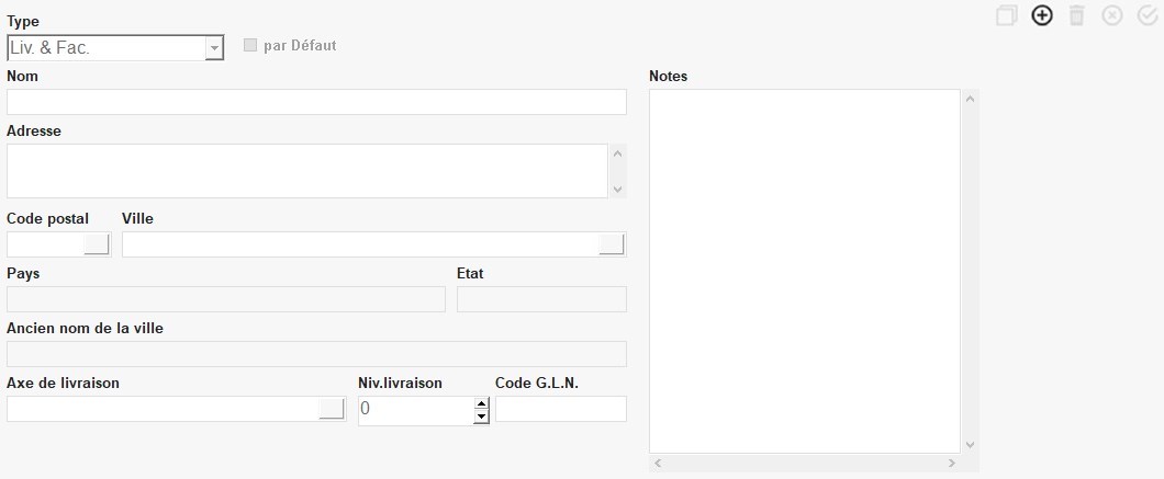 - Type : choisir le type d’adresse : Liv & Fac , Livraison , Facturation , Administrative (envoi des factures à une autre adresse admin, sert pour l'édition des enveloppes).Dans la collection, les adresses de type livraison seront en rouge, facturation en bleu, liv/fac en vert et administrative en noir.