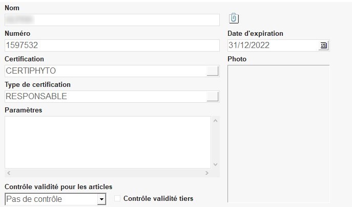 A remplir pour les tiers soumis à obligation de présenter une certification pour commercer avec l’entreprise (ex : achat, stockage, …) (Idem Certification (Appro)) . Un contrôle peut être effectué entre ces enregistrements et les articles concernés au moment de la saisie des pièces.