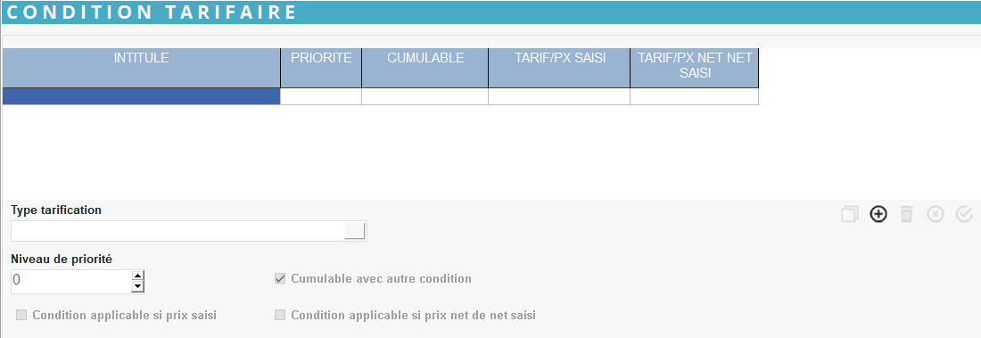 Si décoché alors la condition appliquée sera celle qui aura la priorité maximale (voir champ “niveau de priorité”) et aucune autre condition tarifaire ne s'appliquera en plus. - Condition applicable si prix saisi