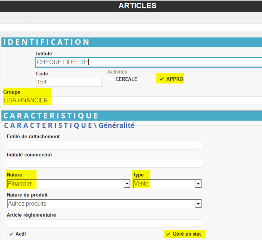 Si besoin, créer un groupe article LISA FINANCIER afin de rassembler tous les articles Chèques fidélités et autres …