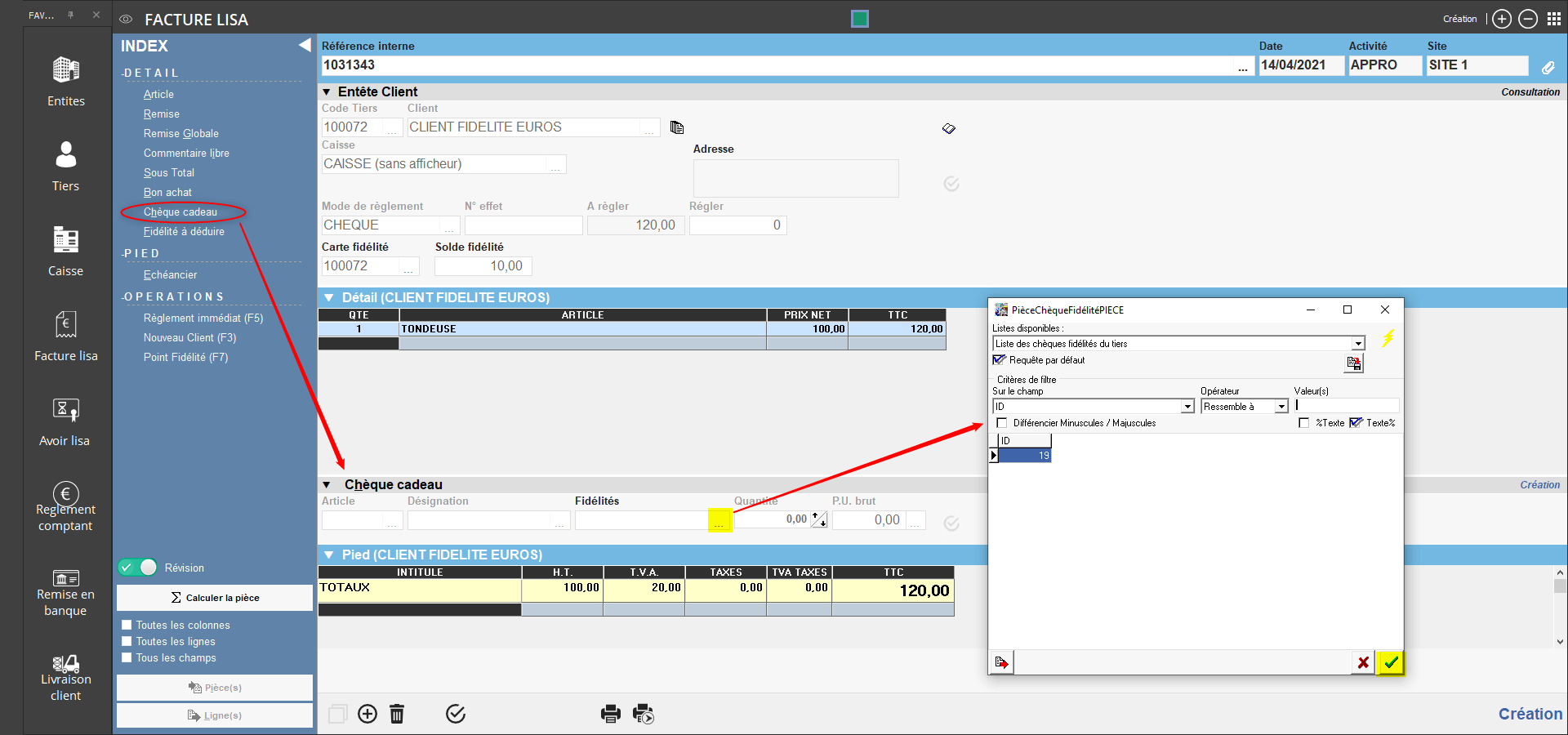Sélectionner Chèque cadeau via l'index de la pièce de facture LISA.