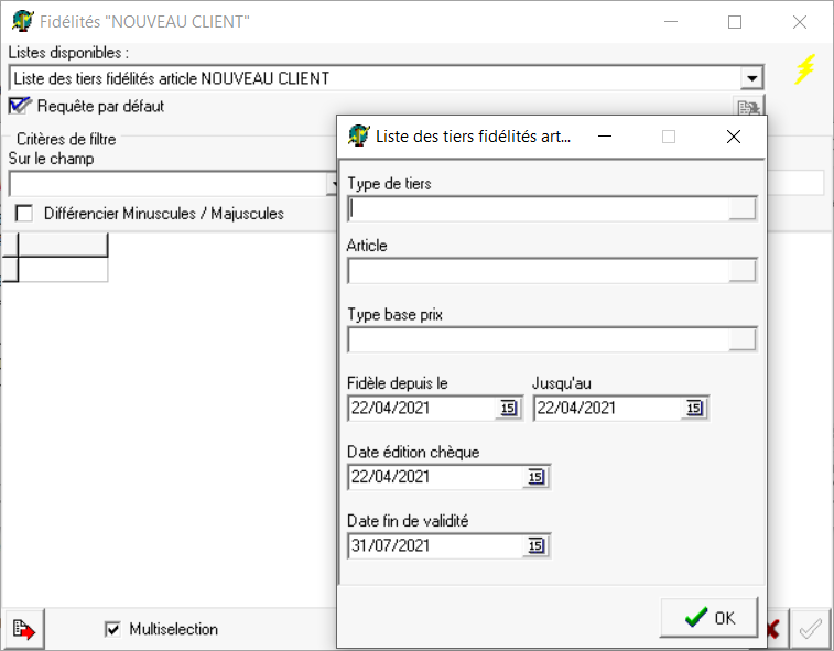 Sélectionner la liste des tiers fidélité article NOUVEAU CLIENT puis cliquer sur l'éclair jaune et renseigner les paramètres suivants :