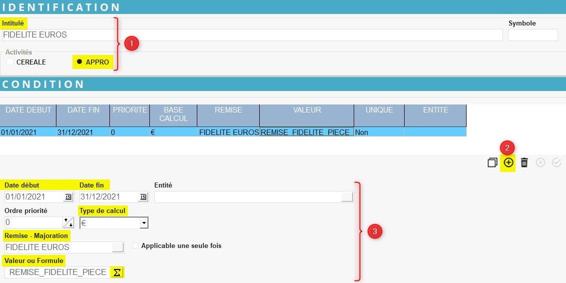 Conditions fidélités par quantité : Renseigner uniquement les paramètres surlignés