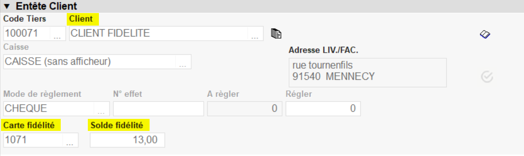 Le solde cumulé au dernier ticket validé est visible dans le champ Solde fidélité de l'entête de la pièce.