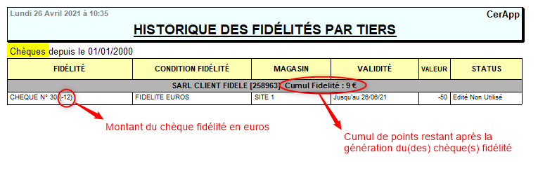 Traitement -> Fidélité -> Génération des chèques fidélité