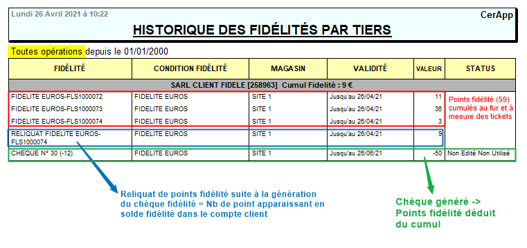 - Chèques : ne présente que les chèques fidélité générés (édités ou non, utilisés ou non).