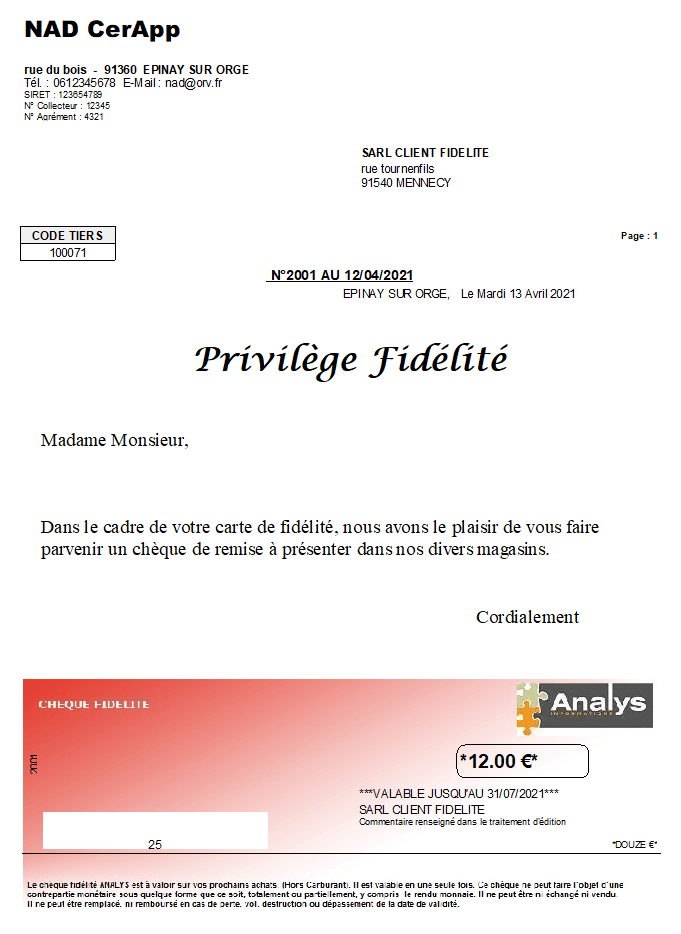 Edition des chèques fidélités