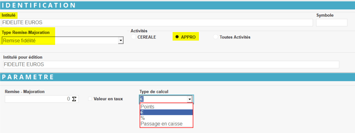Sélectionner le type de calcul avec lequel la remise doit fonctionner : Points, Euros, Pourcentage ou Passage en caisse, cumulés. - Remise-Majoration