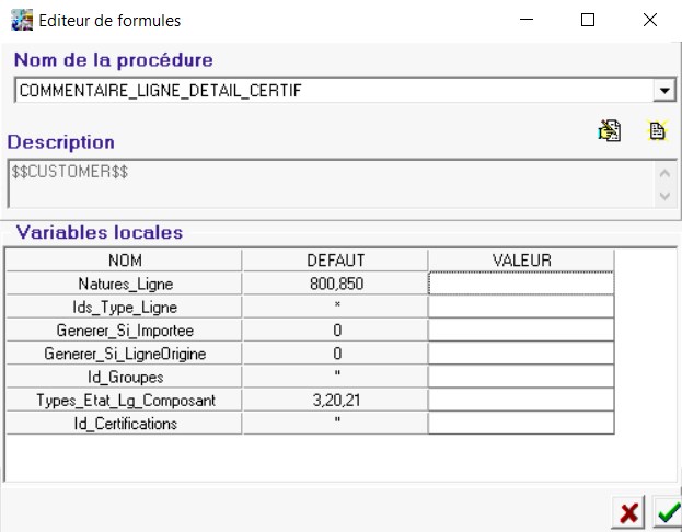 Formule permettant de stocker dans la pièce, les certifications nécessaires, sous forme de commentaire, de façon à ce qu'à la réédition de la pièce, la certification ne soit pas modifiée. (A partir de la version V22)Positionner le commentaire en entête ou en pied pour éviter que les certifications remontent à chaque ligne détail.