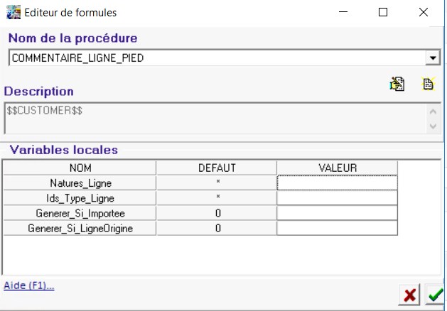 Formule permettant de paramétrer les commentaires situés en ligne pied des pièces concernées.