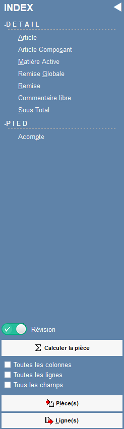 - Détail/Pied : Il permet de choisir les différents types de ligne disponibles utilisables dans la partie DETAIL/PIED. Y faire appel par clic gauche sur l’intitulé de la ligne ou par le raccourci clavier CTRL + Lettre surlignée dans l’INDEX (ex CTRL + A appel ligne ARTICLE).