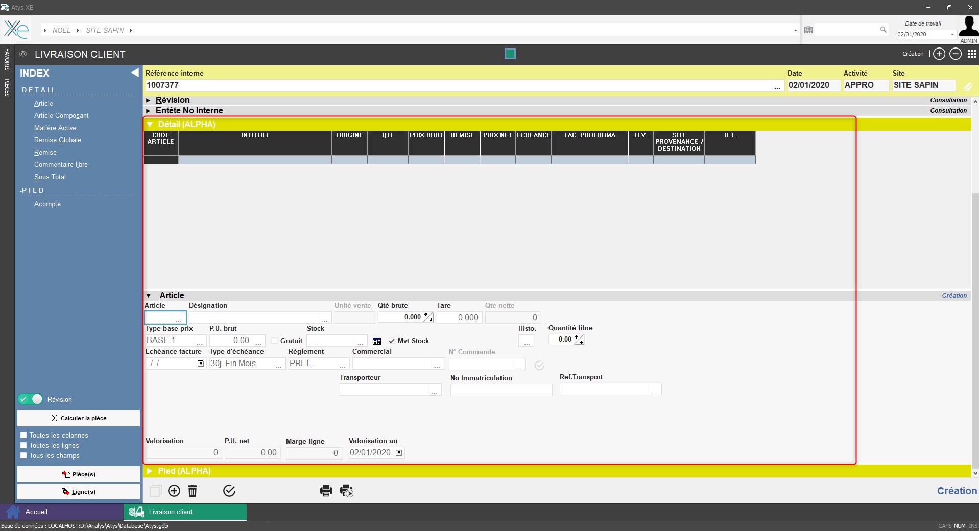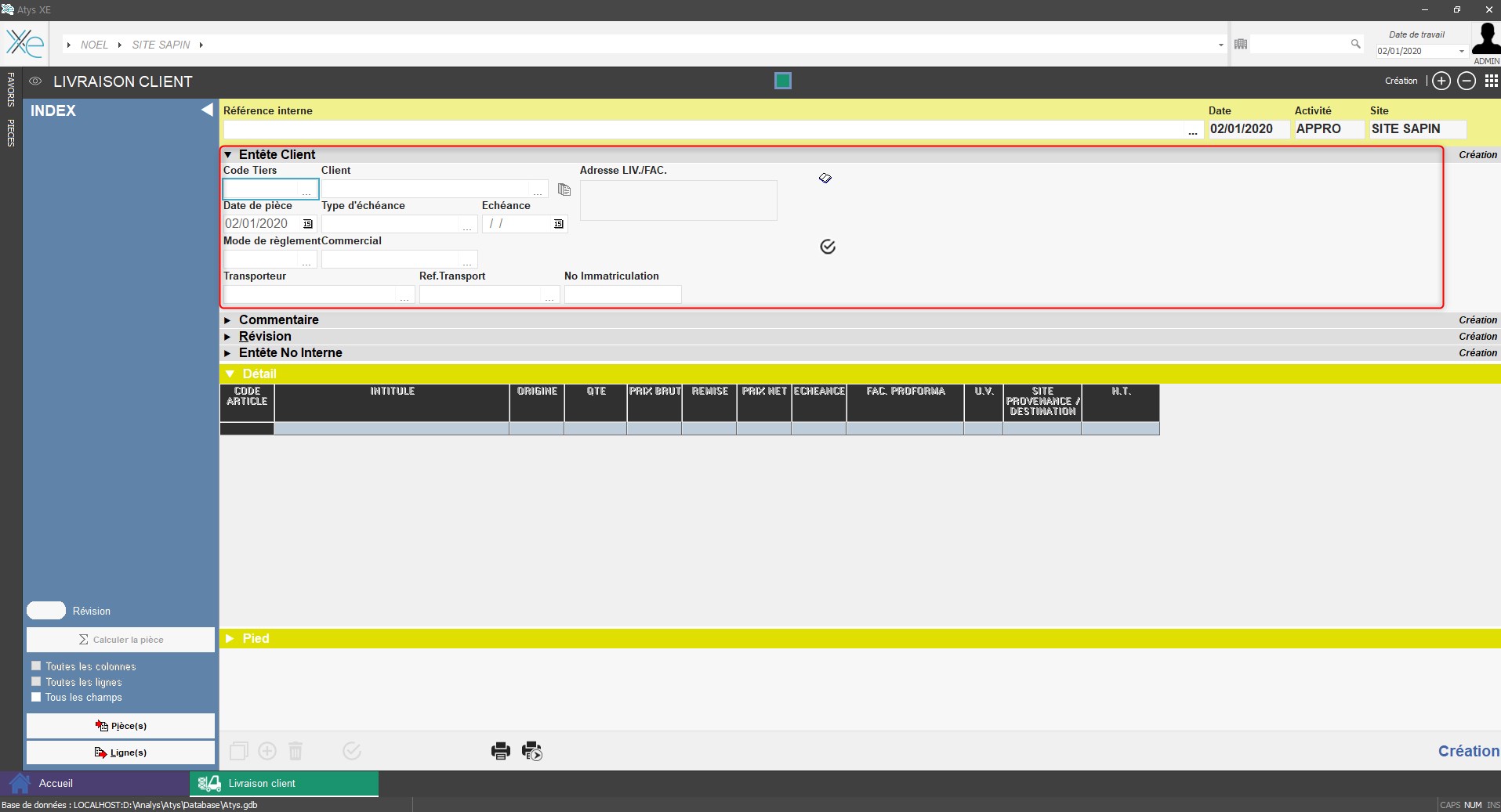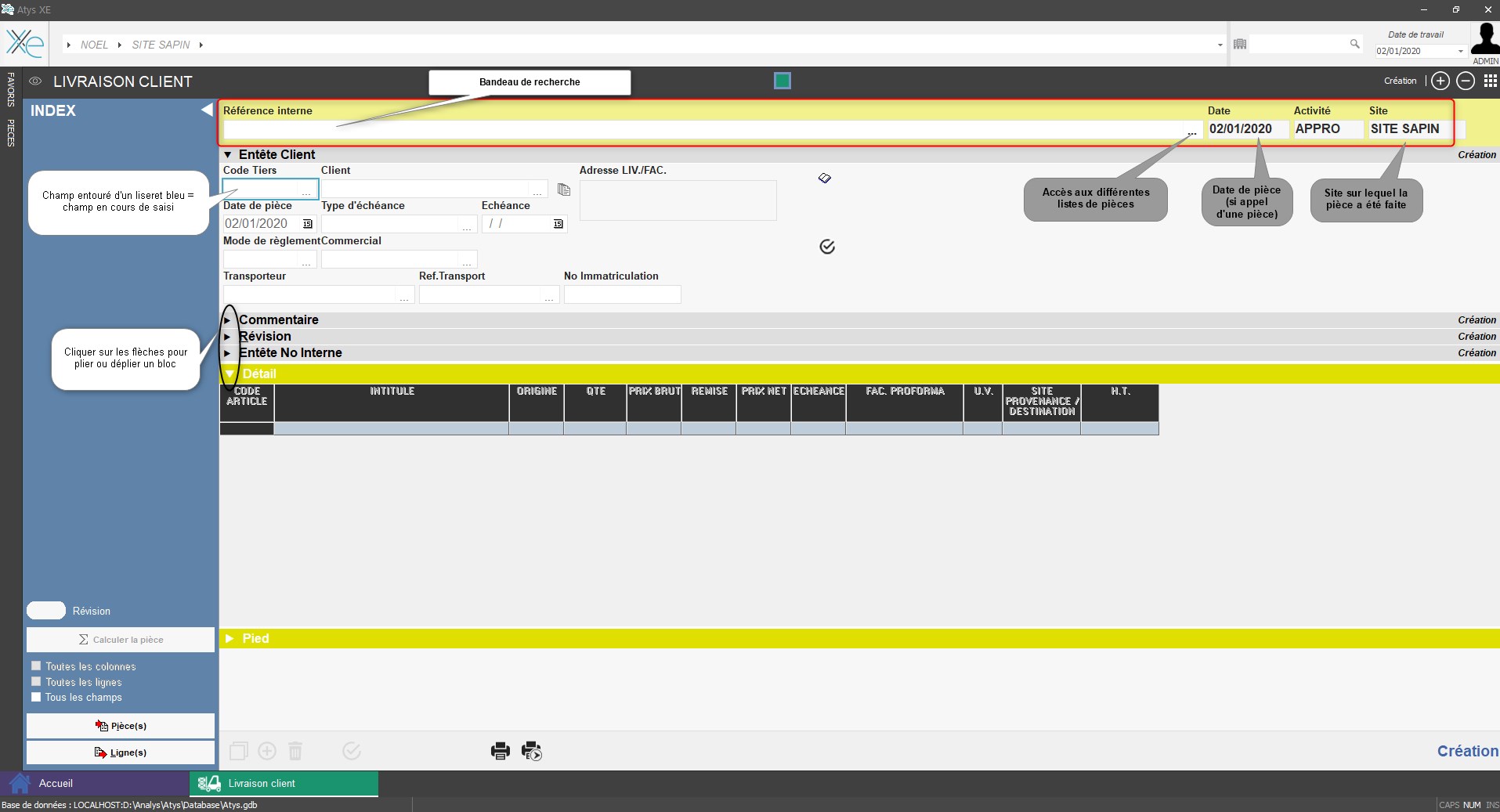 - Le bloc détail permet l'accès pour choix de saisie des différents types de lignes proposés dans l'INDEX.