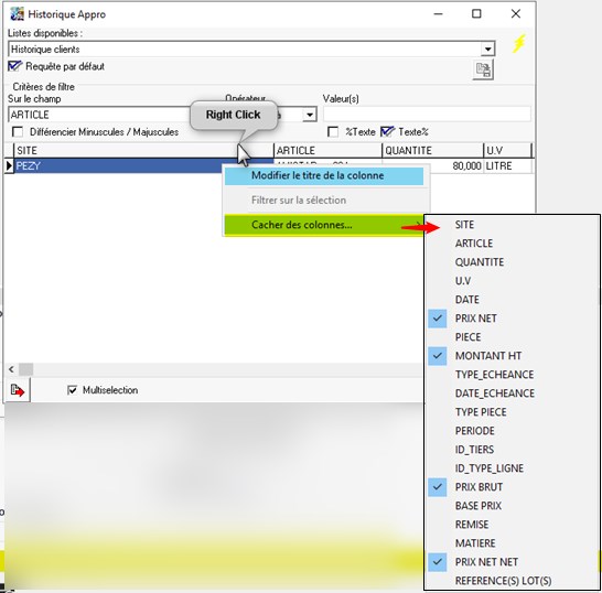 Possibilité de cacher/Visualiser ou renommer des colonnes par Clic droit dans le tableau des résultats de la requête.