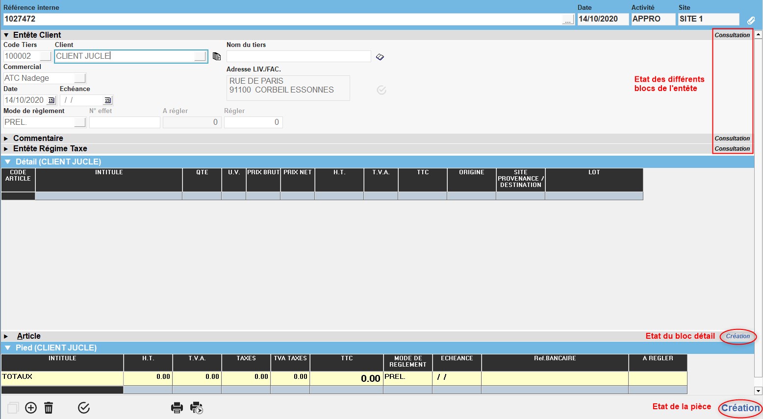 - Pour créer une nouvelle pièce, quitter le champ Référence Interne , se positionner sur le premier champ du bloc “en-tête” de la pièce (Entête client dans notre exemple).