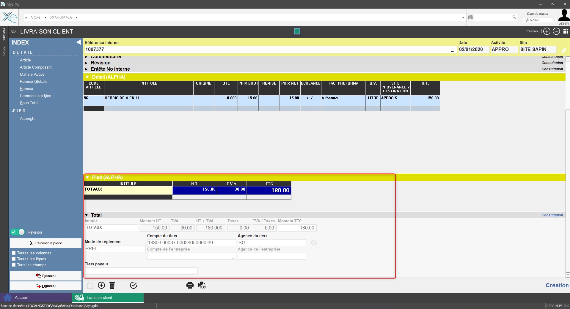 - Le bloc pied de pièce permet l'accès pour choix des différents types de lignes proposés dans l'INDEX (Echéancier manuel, Acompte, Règlement immédiat, Point de fidélité, etc…).