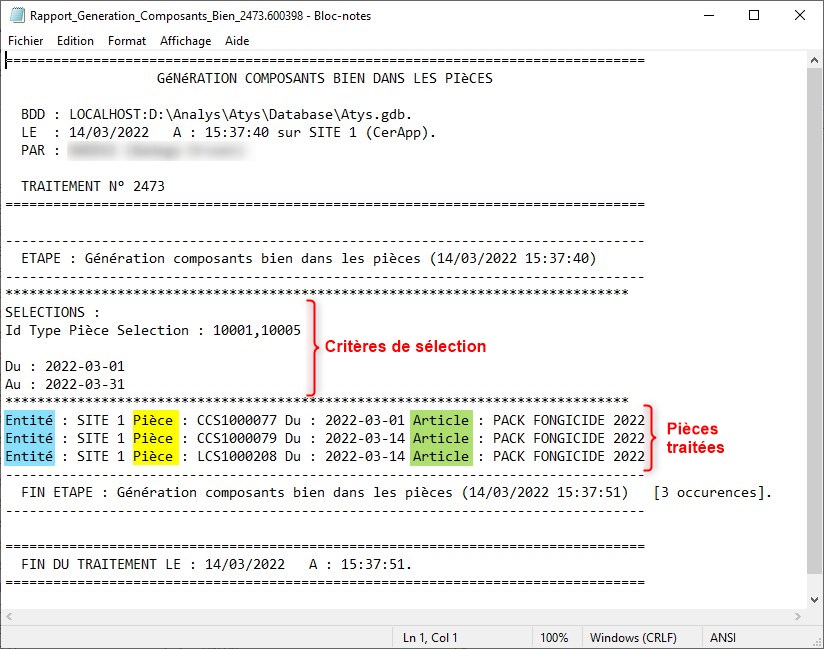 Le rapport de traitement indique le site, les pièces et l'article modifiés :