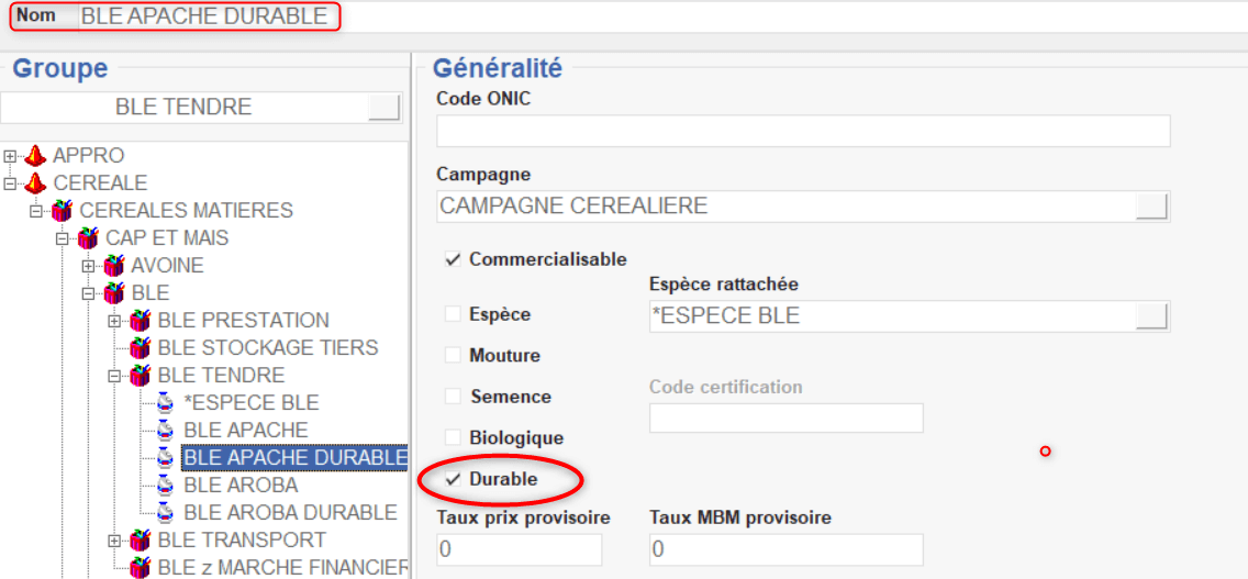 ), le nommer “durable” (ex : Blé Apache Durable) et le déclarer comme suit :