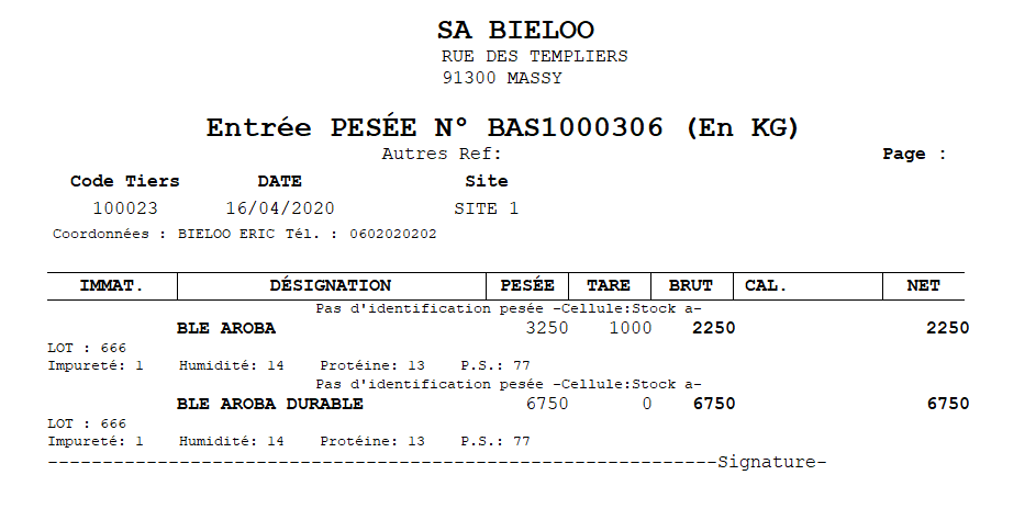 - Soit, elle intervient au niveau de la création du Bon d'Apport, généré par la pièce Pont Bascule, et le ticket de pesée ne comportera alors que la variété saisie.