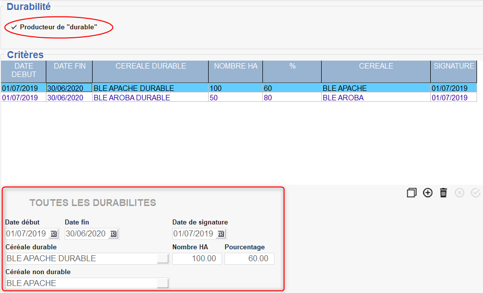 Le bon fonctionnement de la répartition entre variété durable et non durable dépend du paramétrage des critères de vérification de la durabilité dans le bon d'apport (vérification de la date de signature du courrier et gestion de la répartition Durable/Non Durable à la validation de la pièce).