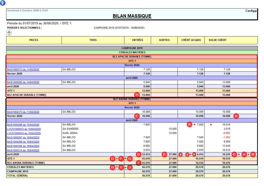 Bilan massique : Edition à transmettre en cas de contrôle. Bilan sur la campagne et mois par mois des entrées et sorties de durable.