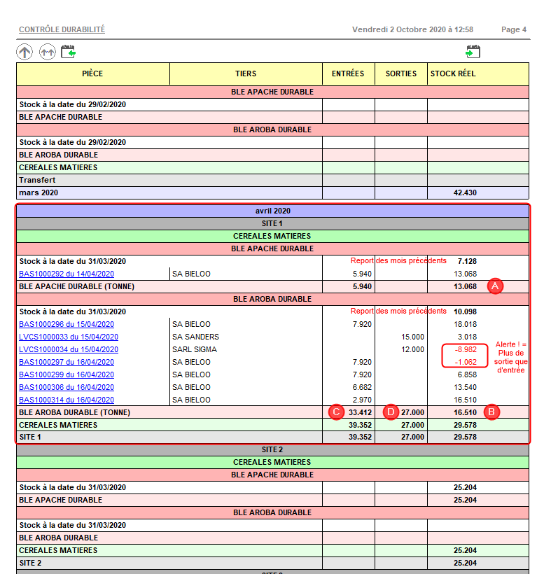 Contrôle durabilité: Edition utile à titre indicatif pour la vérification des entrées et sorties de durable, par mois.