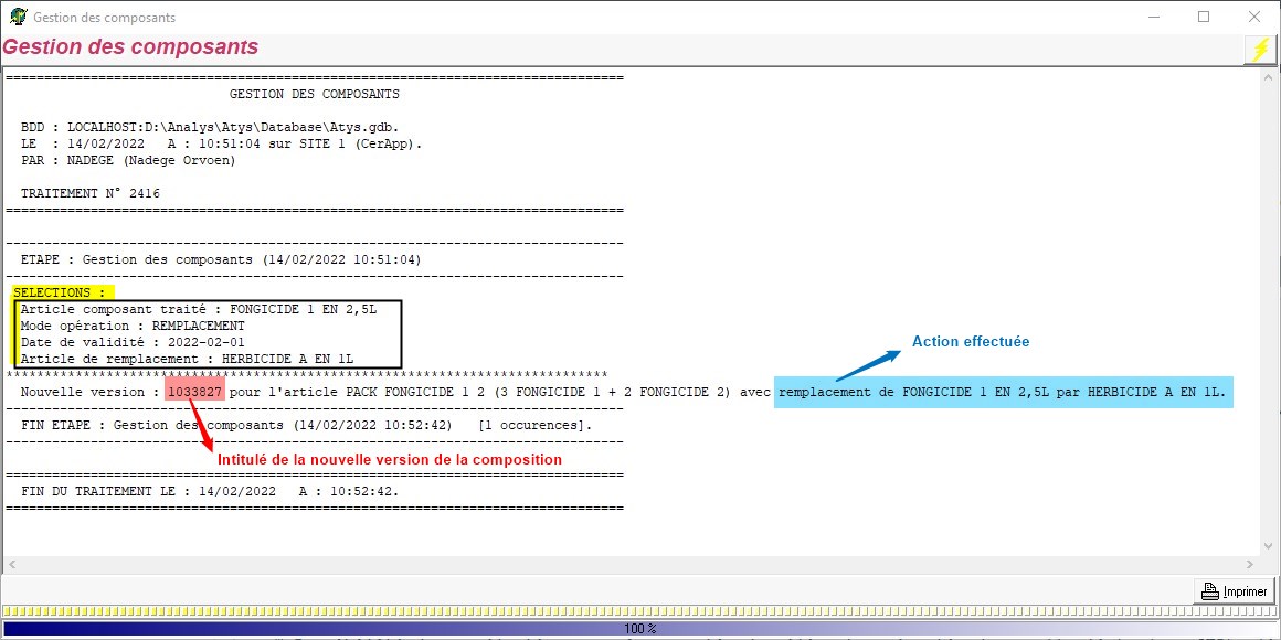 Le rapport de traitement indique l'intitulé de la nouvelle version et l'action effectuée :