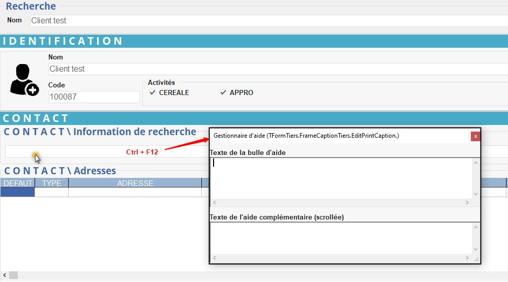 Il est possible, dans certains champs où cela a été prévu (fiches, pièces, etc…), de paramétrer des info-bulles qui s'affichent, au passage de la souris sur le champ, dans Atys. Ces informations seront alors accessibles à tous les utilisateurs.Dans AtysXE, ces informations sont accessibles par Ctrl+F12 dans le champ concerné, pour les utilisateurs d'un groupe administrateur (priorité < ou = 10).