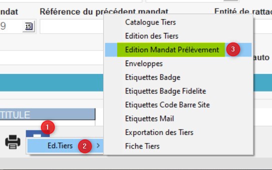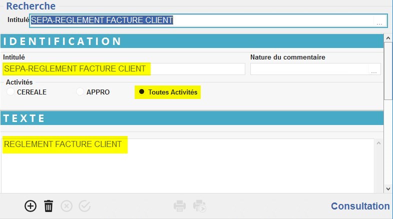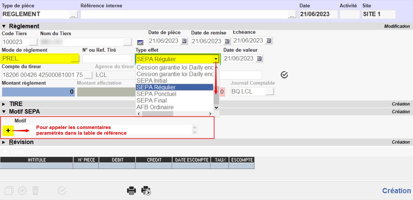 Dans la table de référence des commentaires, créer des commentaires de motif de prélèvement/virement, qui seront à renseigner lors de la saisie en paiement, règlement, dans l'entête de la pièce.