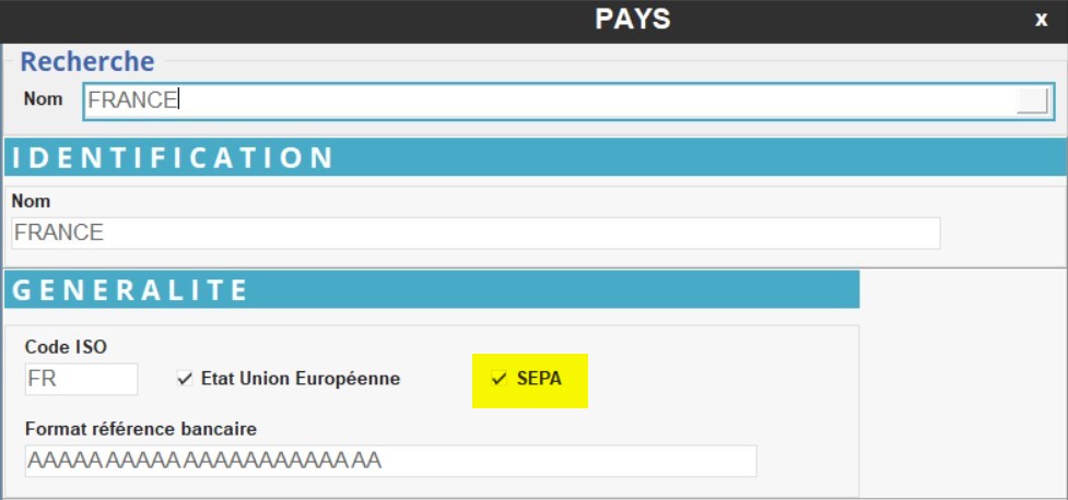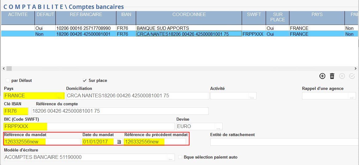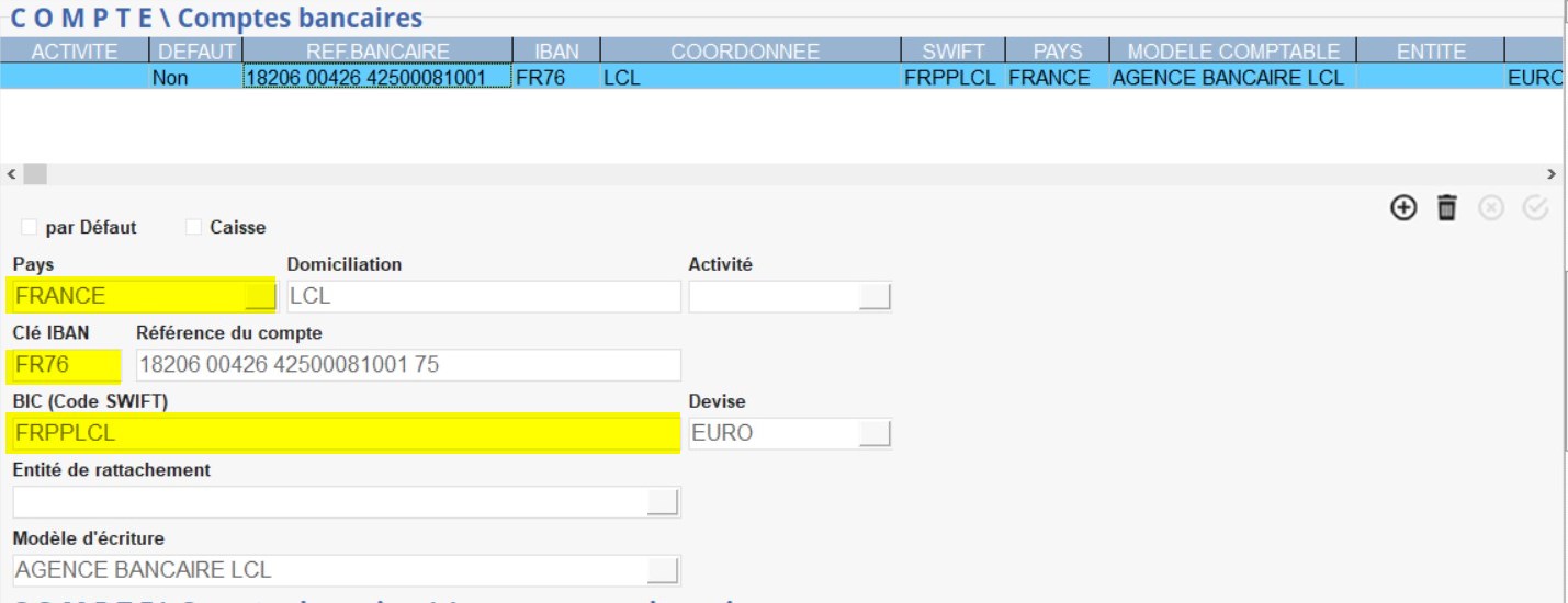 Pour chaque compte bancaire du Tiers (Fiche Tiers : COMPTABILITE\Comptes bancaires), renseigner les informations suivantes :