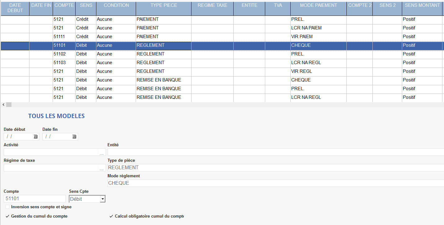 A chaque mode de paiement/règlement par type de pièce, il associe un compte comptable (511, 512, etc…) et un sens (crédit ou débit). Il est possible d'affiner par activité, entité et/ou régime de taxe.