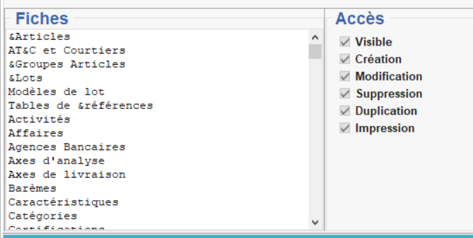 - Pour le Menu , on pourra retirer des droits sur certaines fiches présentes dans le menu Fichier. Sélectionner alors la Fiche concerné et cocher/décocher l'accès à modifier :