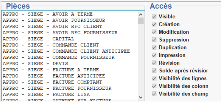 - Pour les Pièces , on pourra retirer des droits sur certaines pièces du circuit administratif. La sélection des pièces concernées se fait par Activité - Site - Pièce. Sélectionner alors la pièce concernée (associée à son activité et site) et cocher/décocher l'accès à modifier :