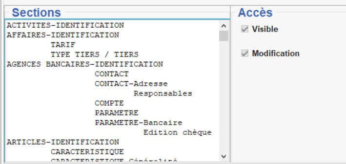 - Pour les Sections fiches , on pourra retirer des droits sur certaines sections spécifiques présentes dans les fiches. On ne peut pas agir sur un champ en particulier mais sur une section complète. Sélectionner alors la section concernée et cocher/décocher l'accès à modifier :