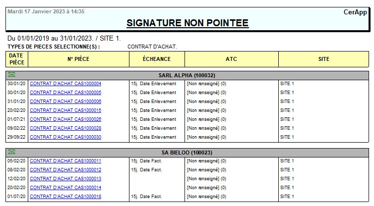 Le pointage des signatures est géré par traitement dans Atys. Il permet d'identifier les contrats/commandes qui ont été signés. Il est ensuite possible de sortir un état des contrats non signés, par exemple, pour relancer les agriculteurs.