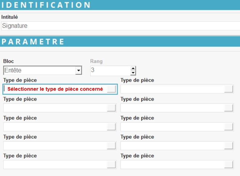 Renseigner le bloc à pointer (Entête, détail ou pied). Pour les “Signatures” il faut laisser “Entête” (car on pointe la pièce comme étant signée ou pas dans son ensemble). - Rang