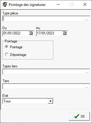 Sélectionner le type de pièce concerné par le pointage de signature. - Du… Au…
