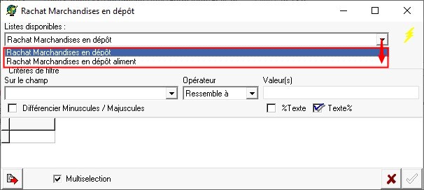 Puis sélectionner le type de marchandises à racheter en ouvrant la liste déroulante (sélectionner l'éclair jaune si la requête proposée est directement celle désirée) :