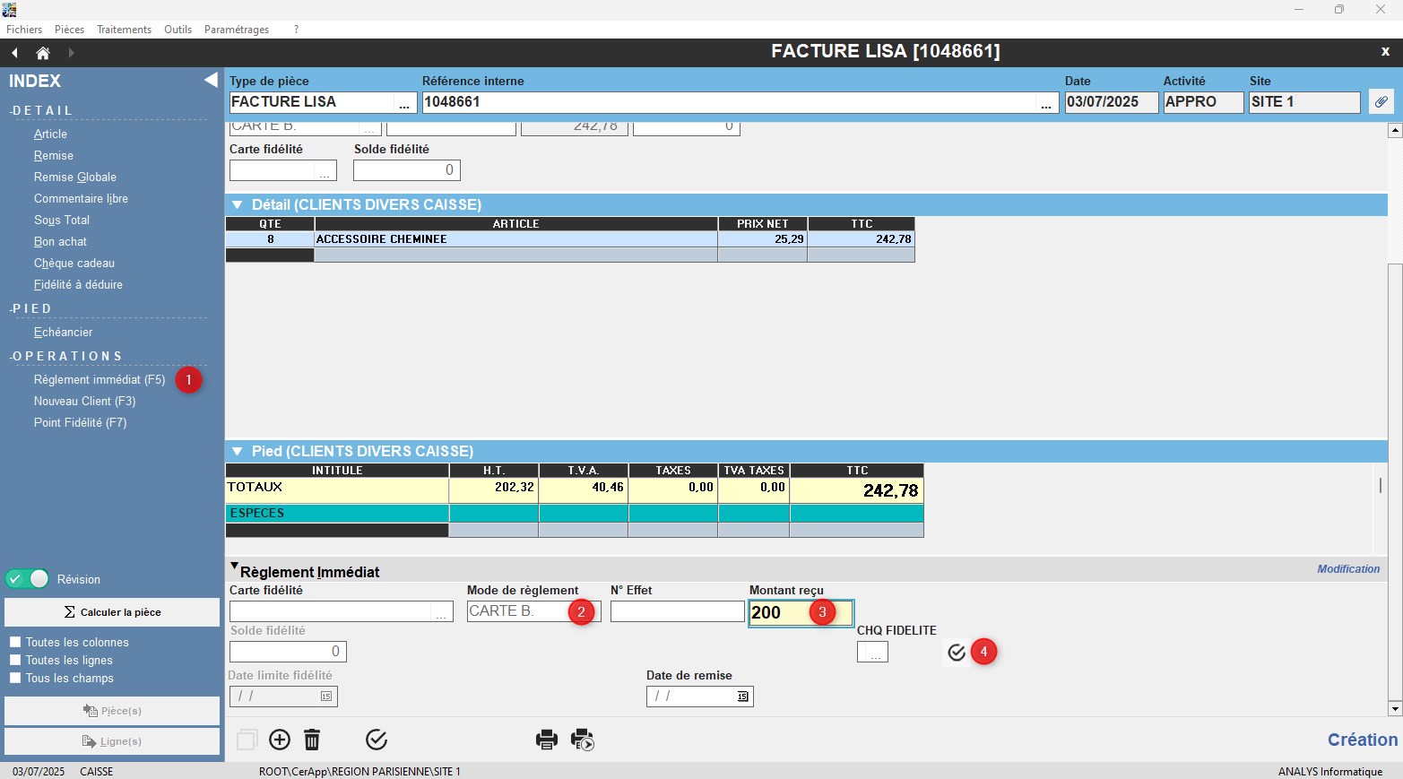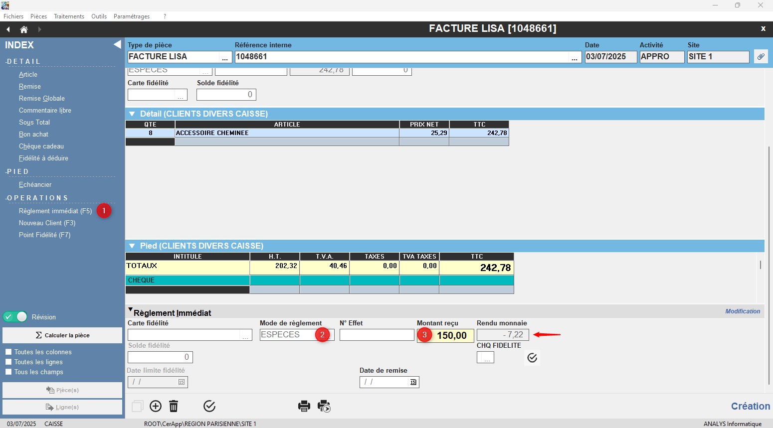 - Renseigner le 1er mode de règlement (Espèce ou chèque).