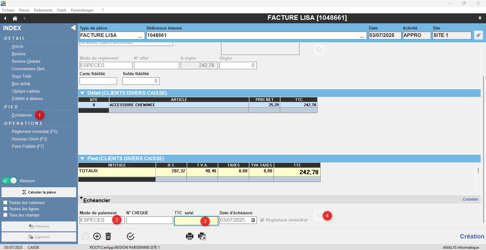 - Depuis l'index, appeler “Echéancier” et renseigner votre 1er mode de règlement (chèque ou CB) et son montant.
