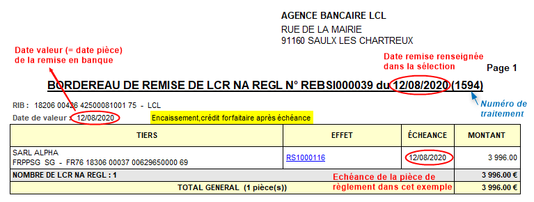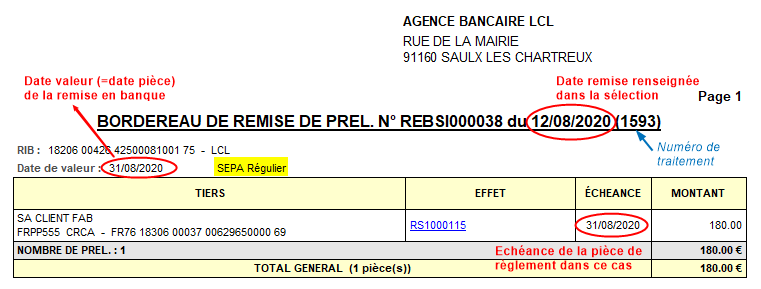 Dans ce cas, la date de pièce de la remise en banque n'est pas la date de valeur de la pièce d'origine, mais la date de remise maxi du champ date de remise maxi du lancement de ce traitement.