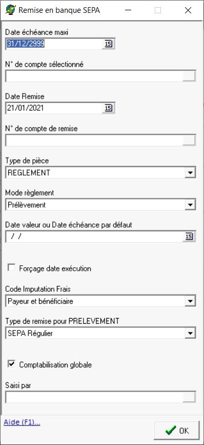 Traitements -> Remise en banque -> Remise en banque SEPA