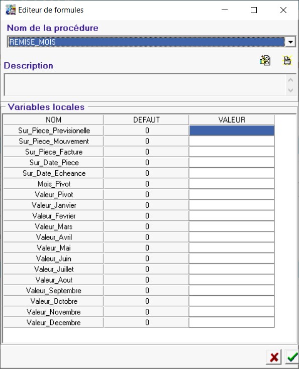 | Valeur Janvier (ou autre mois) | % ou €/UV | Valeur de Remise (précédée du signe -) ou de Majo (sans signe) applicable si le mois de la pièce ou de l'échéance (selon le paramétrage ci-dessus) correspond au mois désigné. Cette valeur sera exprimée en % OU €/Unité de vente suivant le paramétrage indiqué à la rubrique PARAMETRE de la fiche de Remises-Majorations ou CONDITION de la fiche Conditions tarifaires |