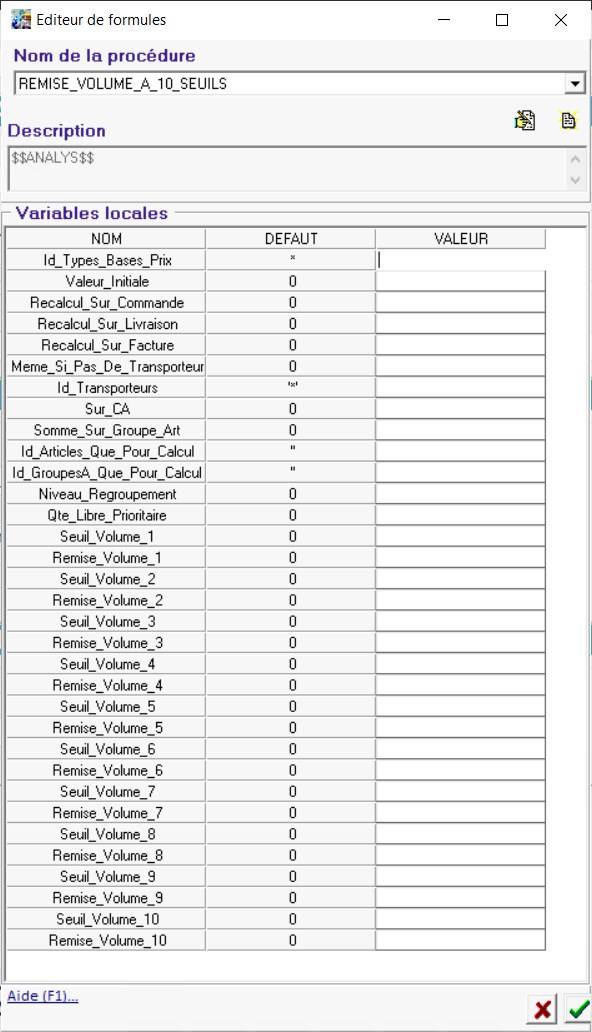 Cette formule doit être rattachée à une Remise/Majo intégrée dans une Condition Tarifaire permettant l’automatisation de son utilisation car elle fait appel à des articles / groupes articles.