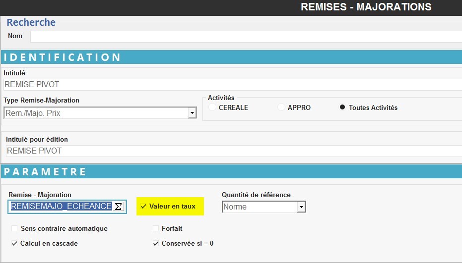 | Mois Échéance Pivot | n° du mois | Numéro du mois qui sert de pivot pour le calcul de la remise (échéance < mois pivot) ou la majoration (échéance > mois pivot). Si le numéro de mois est différent de 1 à 12 alors il sera pris en compte le mois départ campagne comme mois pivot. |