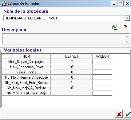 | Valeur Indice | € ou % | Valeur de la remise ou majoration accordée par mois d’écart entre le mois d’échéance et le mois pivot. (en % ou en € en fonction du paramètre « Valeur_En_Taux » de la fiche). |
