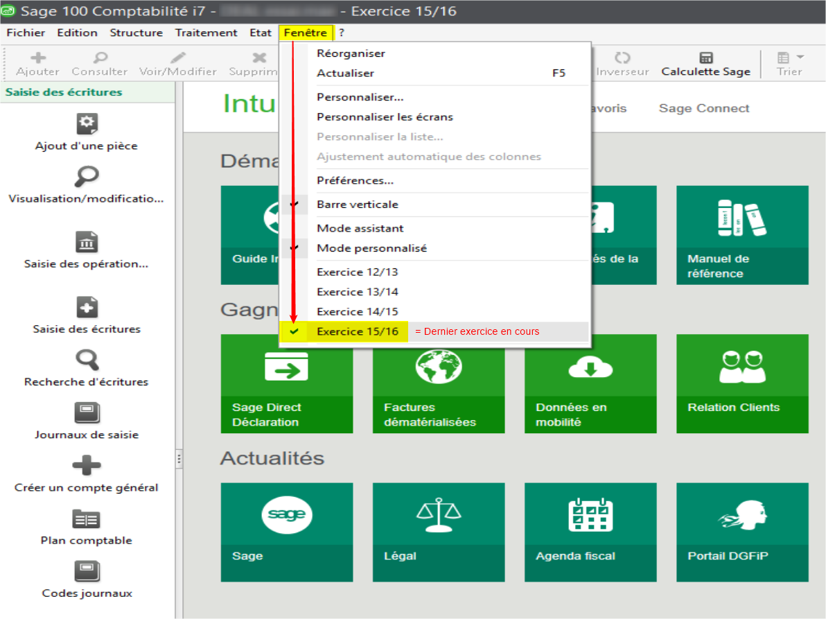 Se placer sur le dernier exercice en cours depuis le menu Fenêtre :
