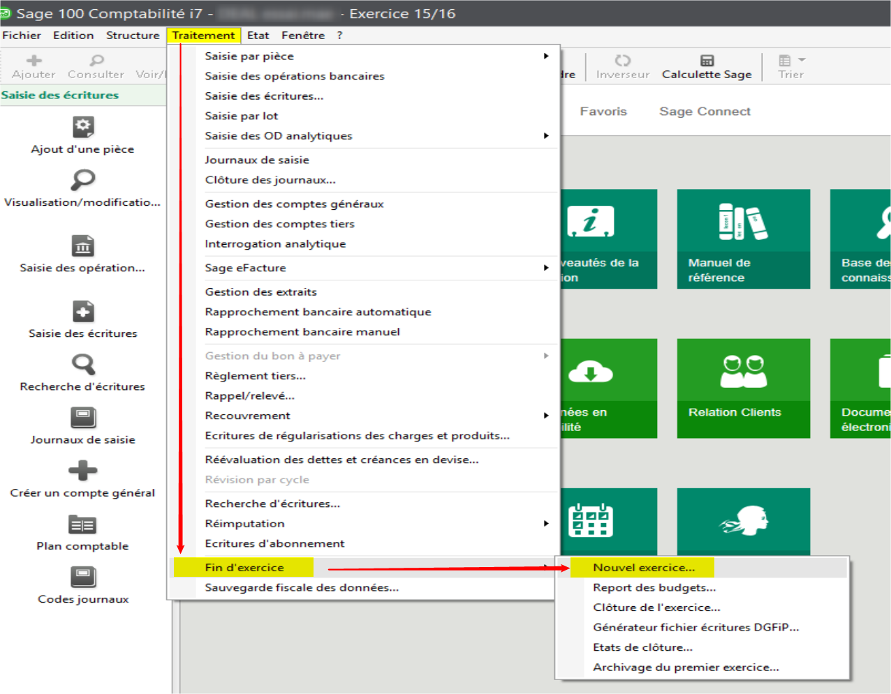 Création du nouvel exercice : Traitement → Fin d’exercice → Nouvel exercice