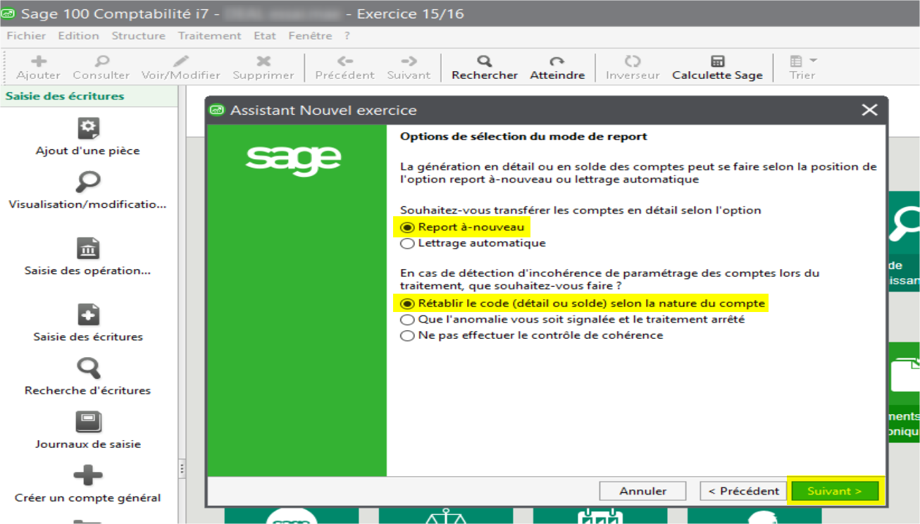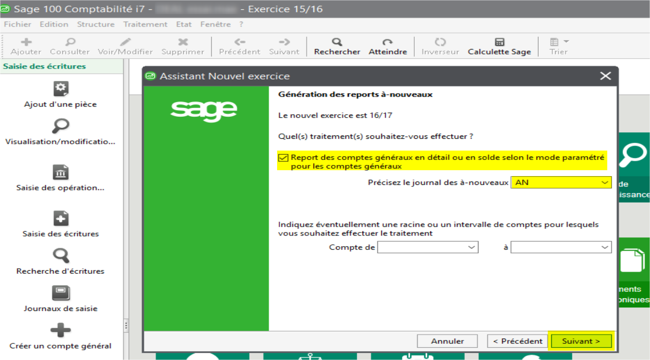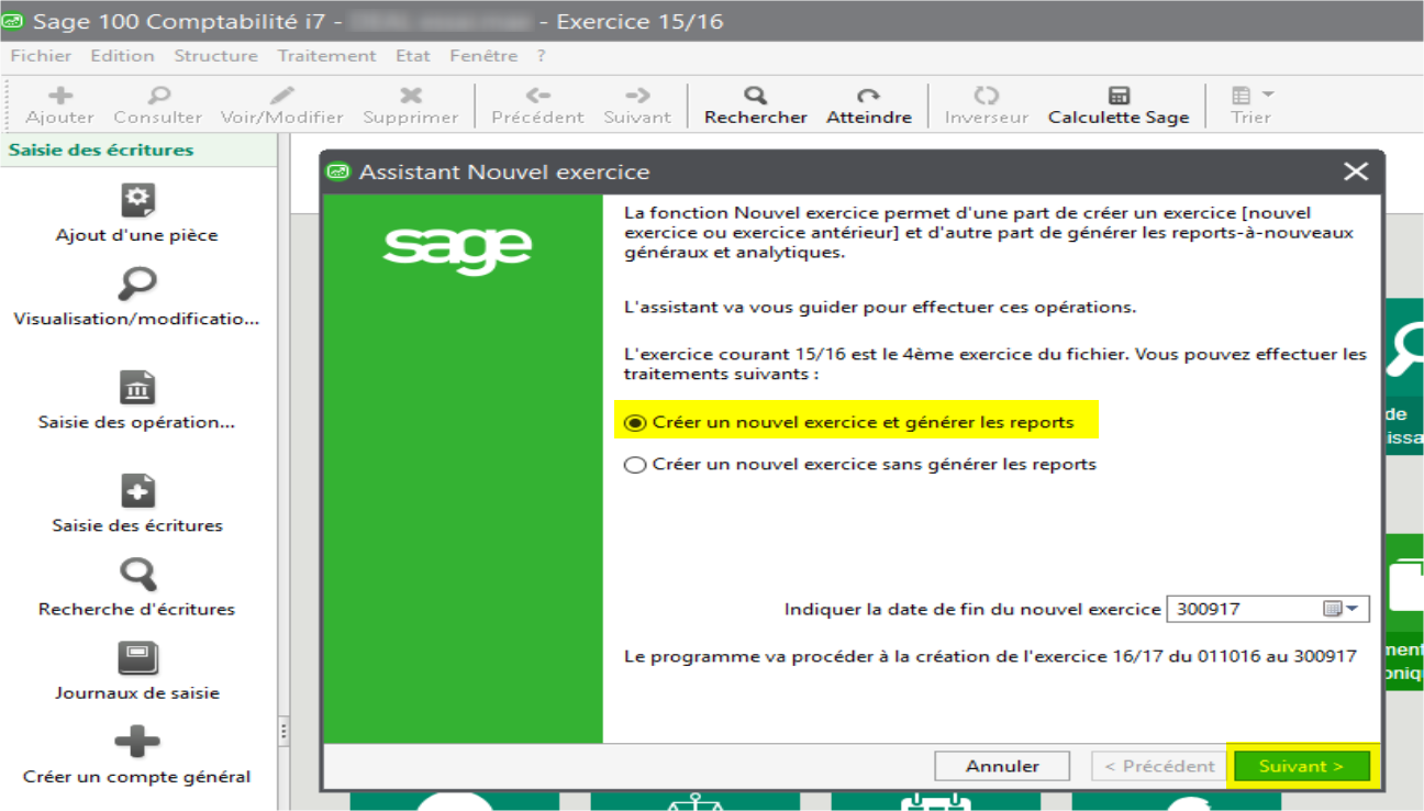 Cocher Créer un nouvel exercice et générer les reports puis Suivant