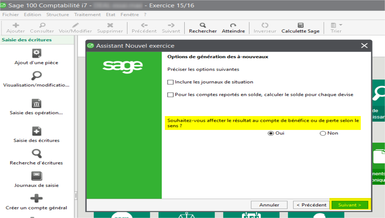 Options de génération des à-nouveaux : Cocher Oui pour affecter le résultat si vous le désirez puis cliquer sur Suivant