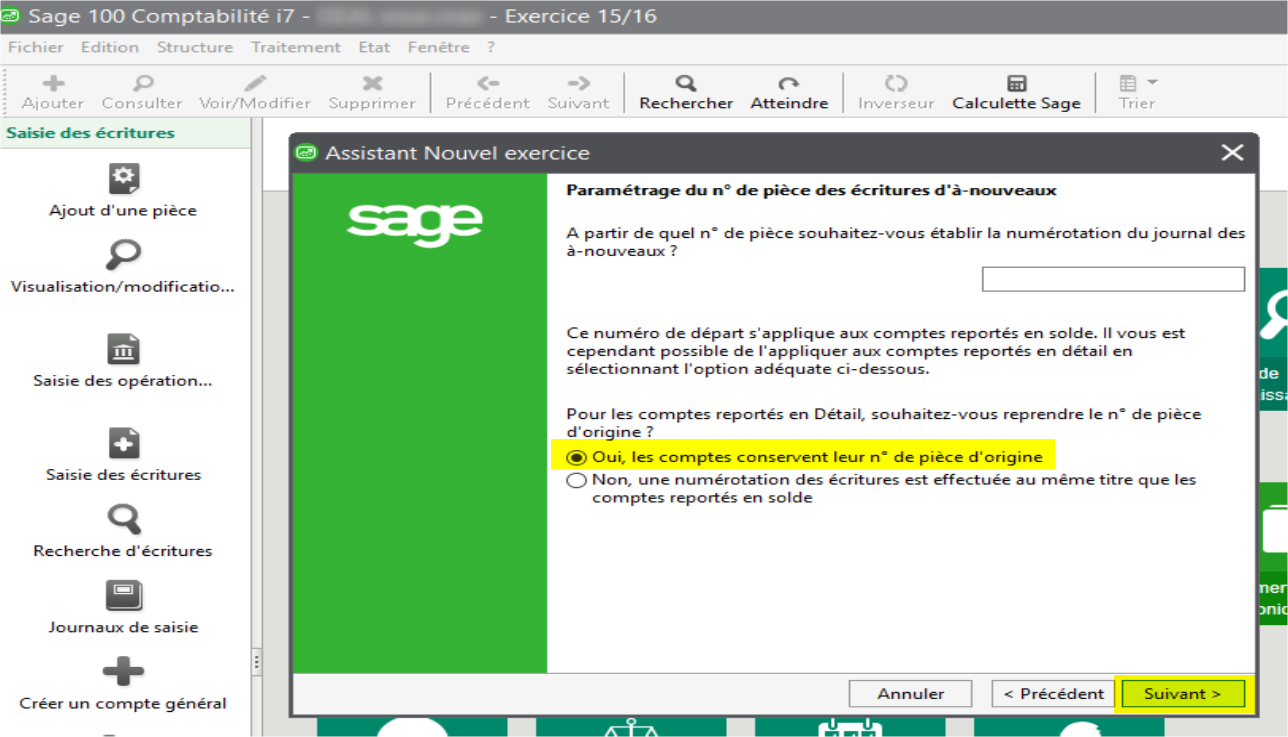 Paramétrage du n° de pièce des écritures d'à-nouveaux : Cocher Oui pour conserver les numéros de pièce d’origine puis cliquer sur Suivant